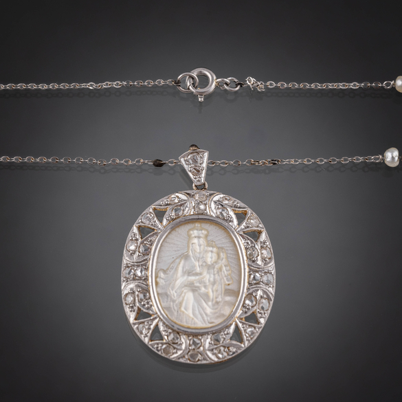 Cadena en oro blanco de 18 kt con perlitas y medalla con orla de brillantes y placa de la Virgen en nácar.