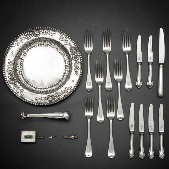 Conjunto de bandeja circular y cubertería incompleta en plata inglesa punzonada del siglo XX.