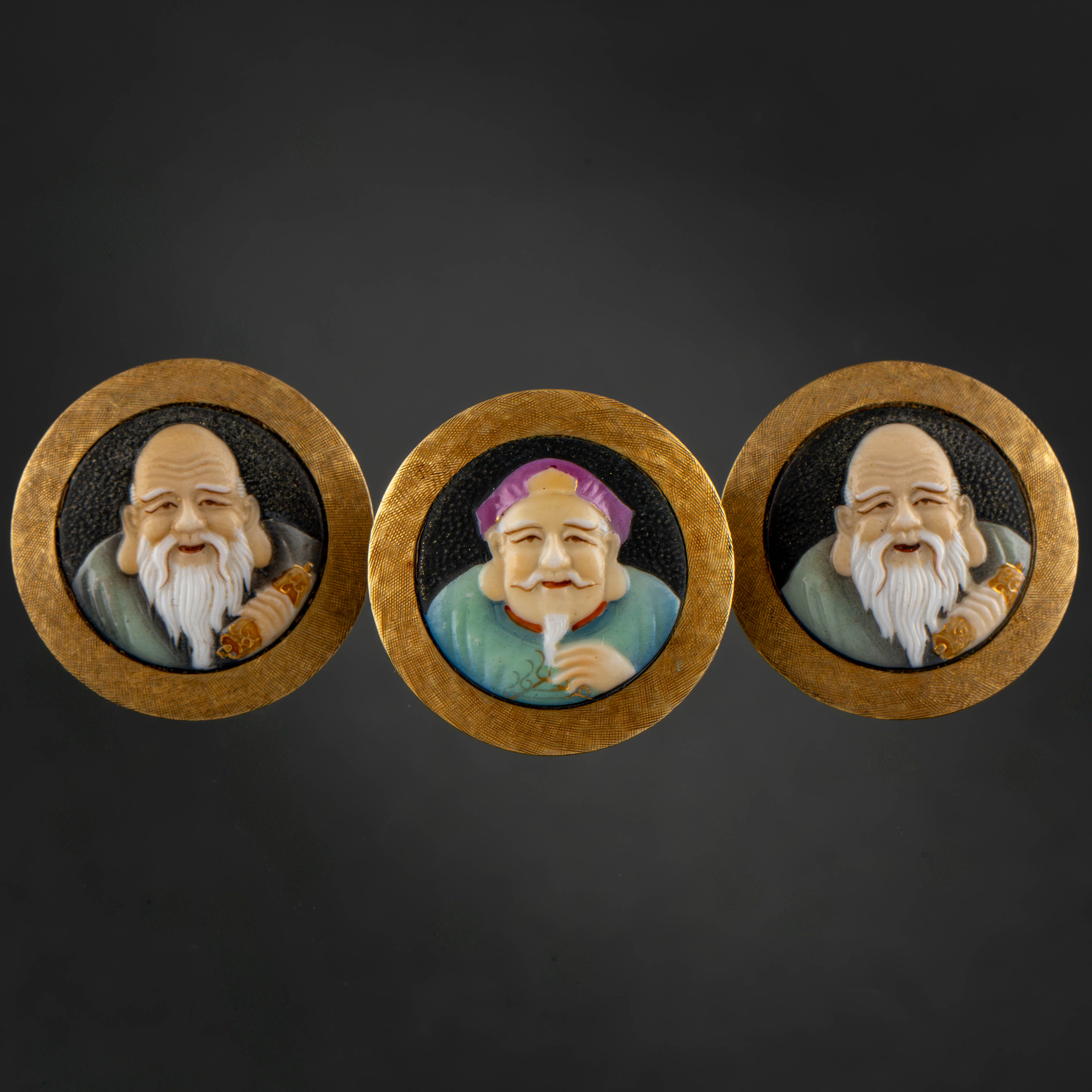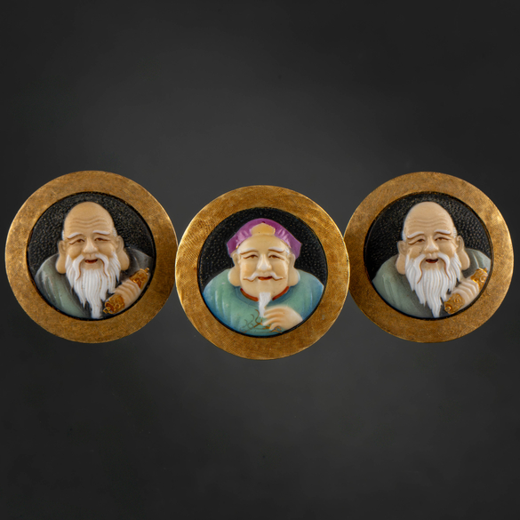 Conjunto de pendientes y anillos en oro amarillo de 18 kt con botones japoneses de arita Toshikane en porcelana.