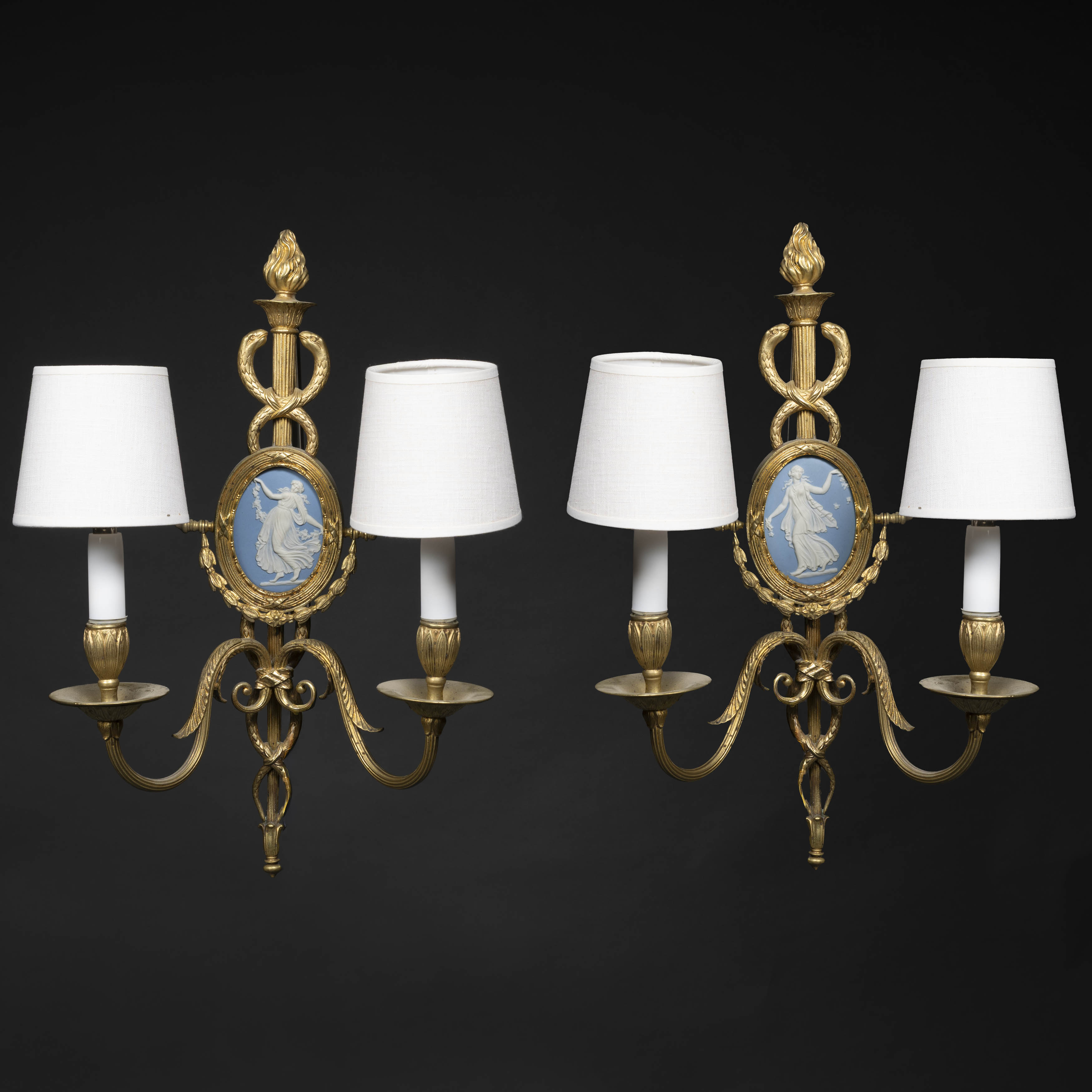 Pareja de apliques de dos luces estilo Luís XVI en bronce dorado y placas en porcelana Inglesa wedgwood del siglo XIX