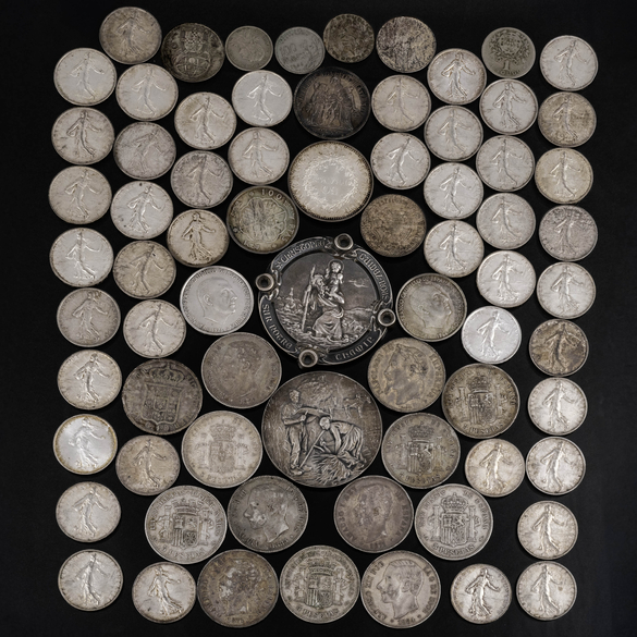 Compuesto por: 14 monedas de 5 pesetas de Alfonso XII y Alfonso XIII. 3 monedas de 100 pesetas del año 1966. 45 monedas de 5 francos franceses de 1960. 7 monedas varias.
