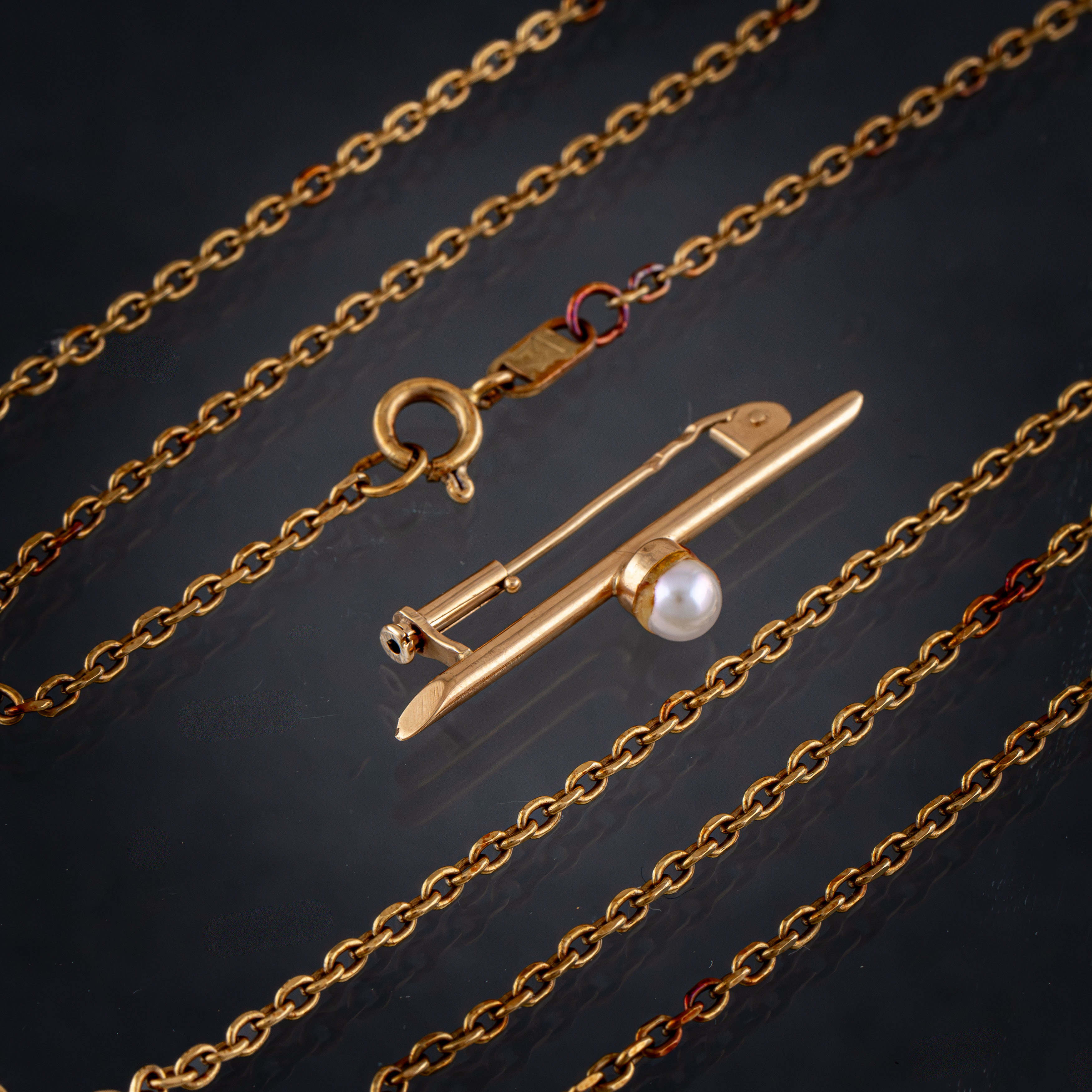 Conjunto de cadena e imperdible con perlita en oro amarillo de 18 kt.