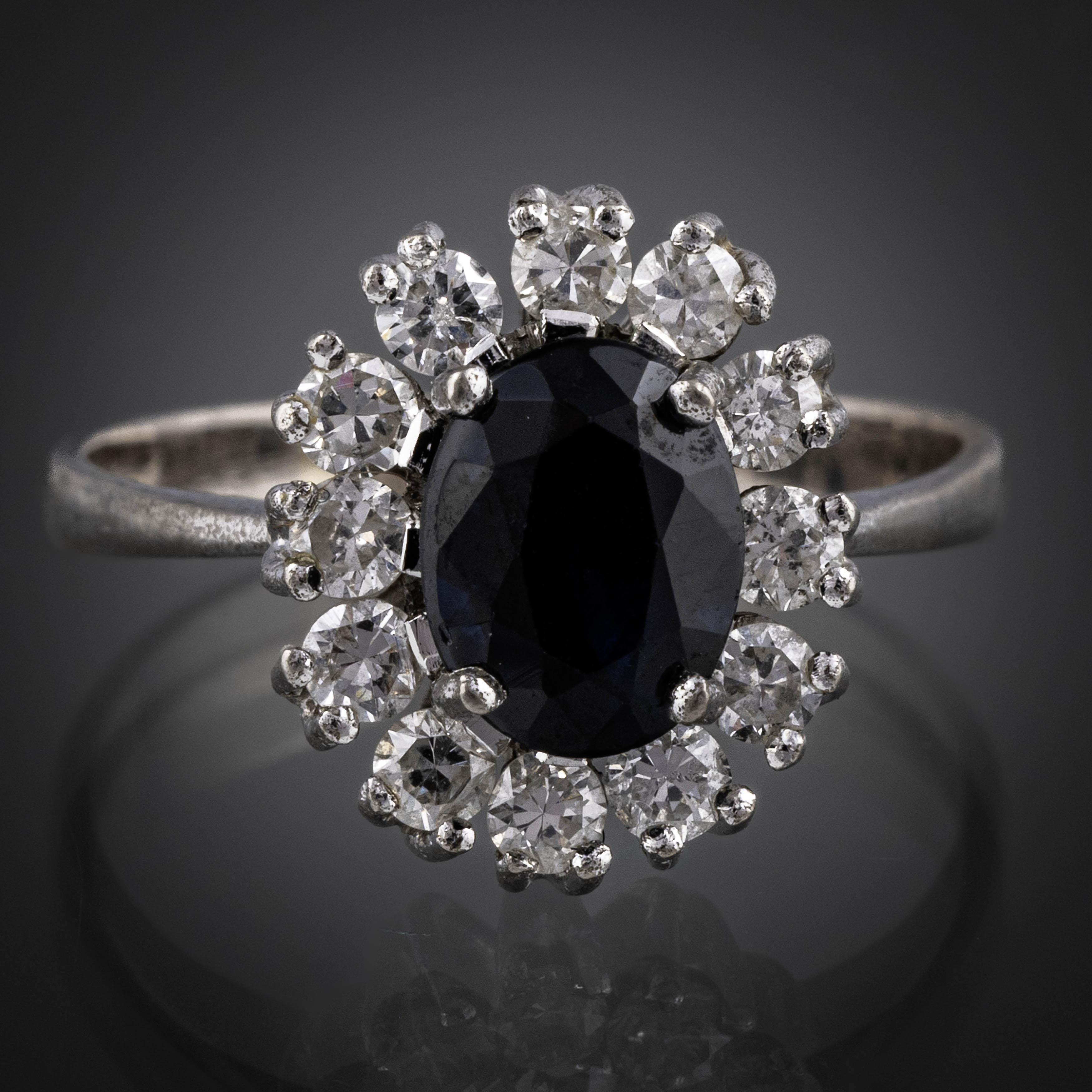Sortija en oro blanco de 18 kt con zafiro sintético orlado de brillantes.